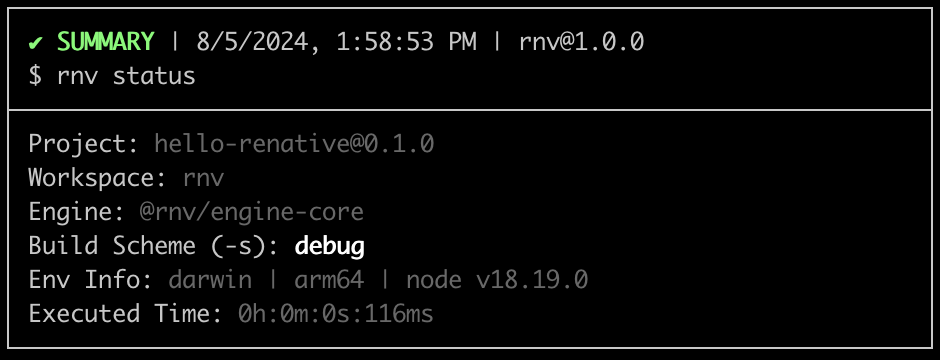rnv run -p <PLATFORM> - runs app with default scheme (-s debug)